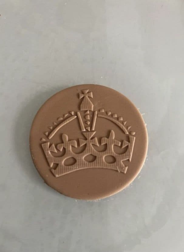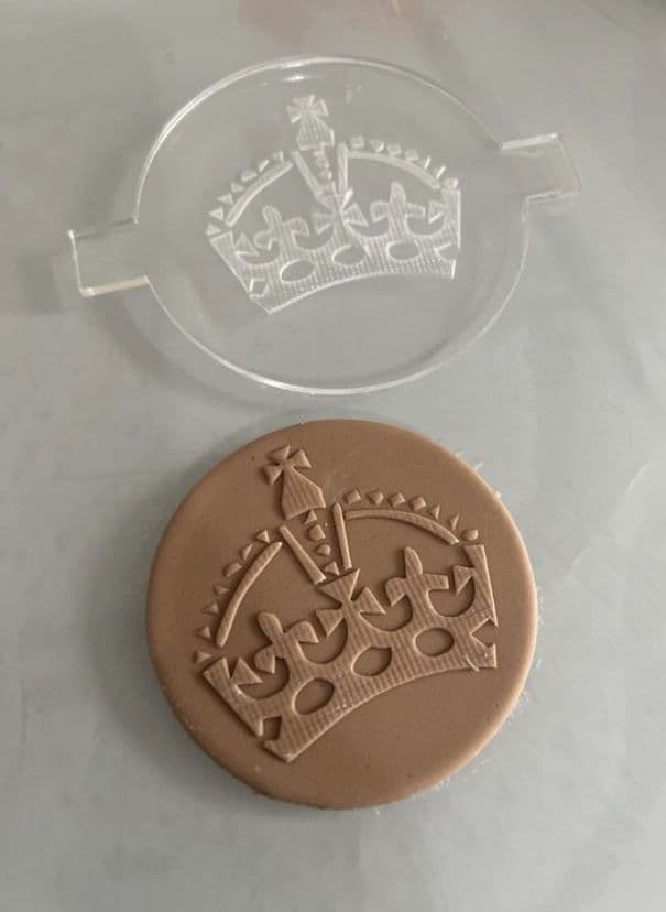Our crown coronation debossers are made from acrylic, they measure 80mm diameter with the image inside measuring approximately 50mm.