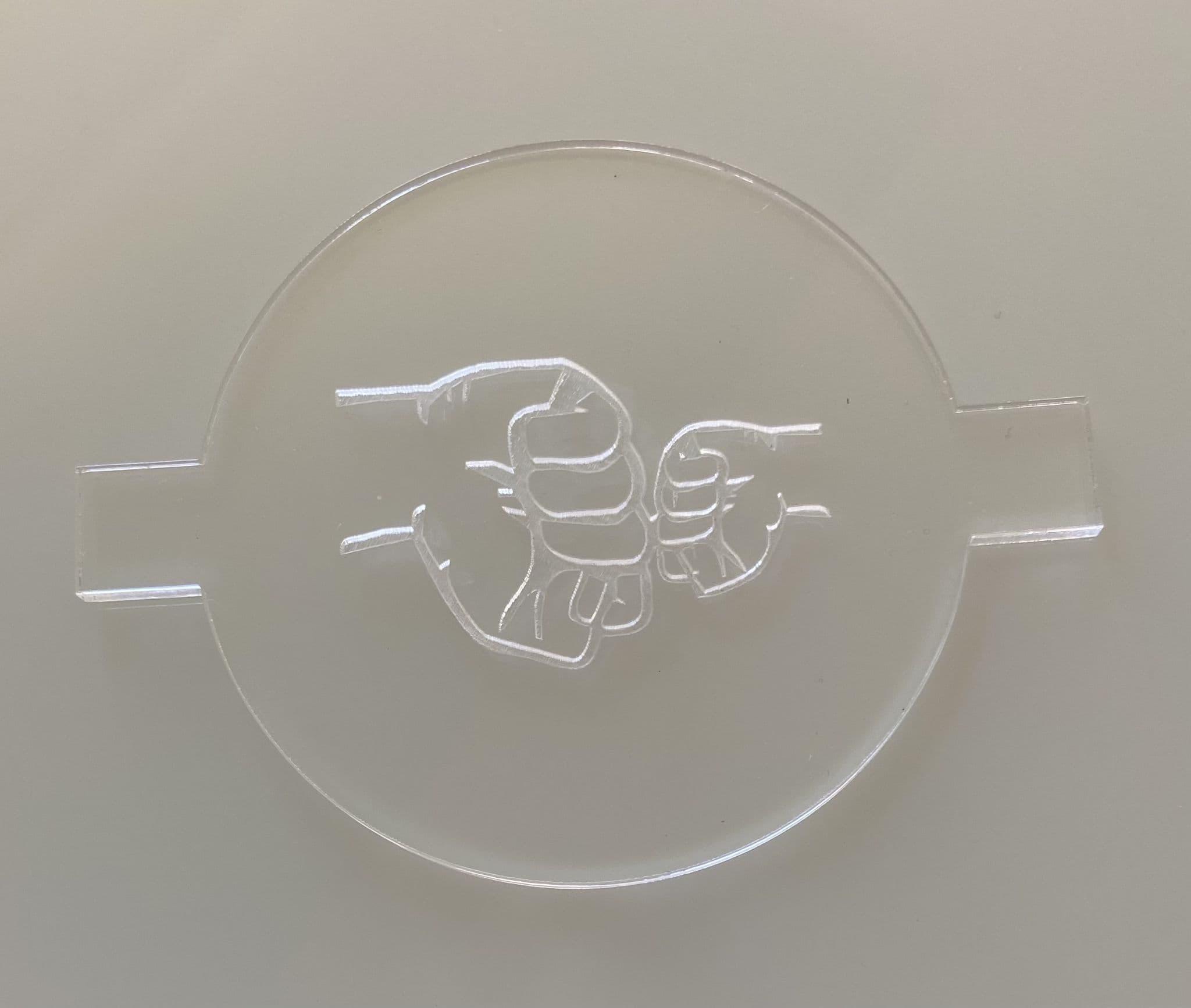 Our fist bump debossers are made from acrylic, they measure 80mm diameter with the image inside measuring approximately 50mm.