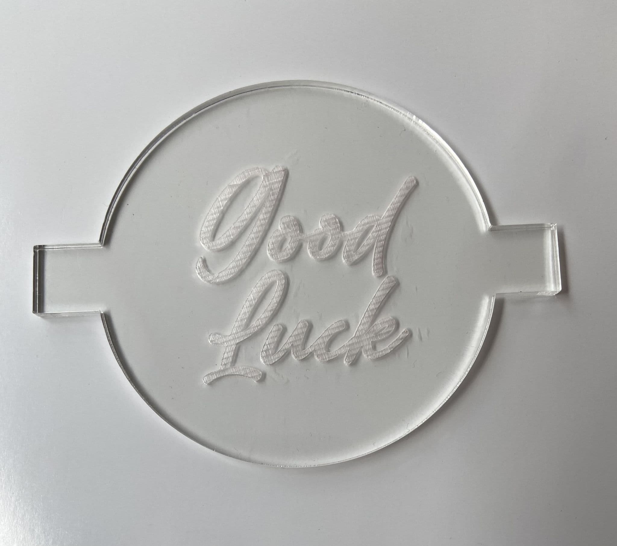 Our good luck debossers are made from acrylic, they measure 80mm diameter with the image inside measuring approximately 50mm.