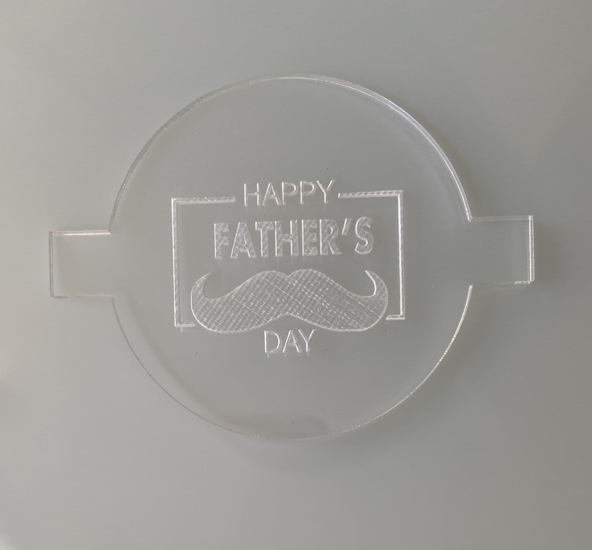Our happy father's day moustache debossers are made from acrylic, they measure 80mm diameter with the image inside measuring approximately 50mm.