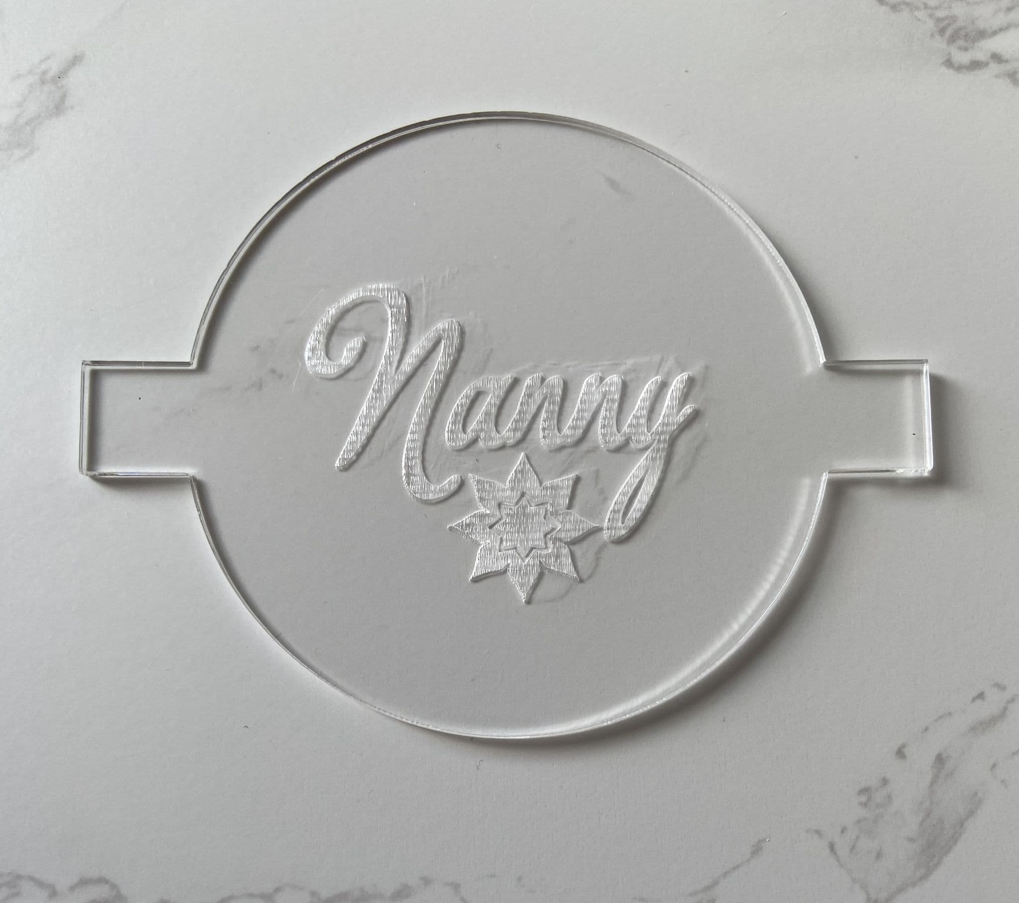 Our nanny with flower debossers are made from acrylic, they measure 80mm diameter with the image inside measuring approximately 50mm.