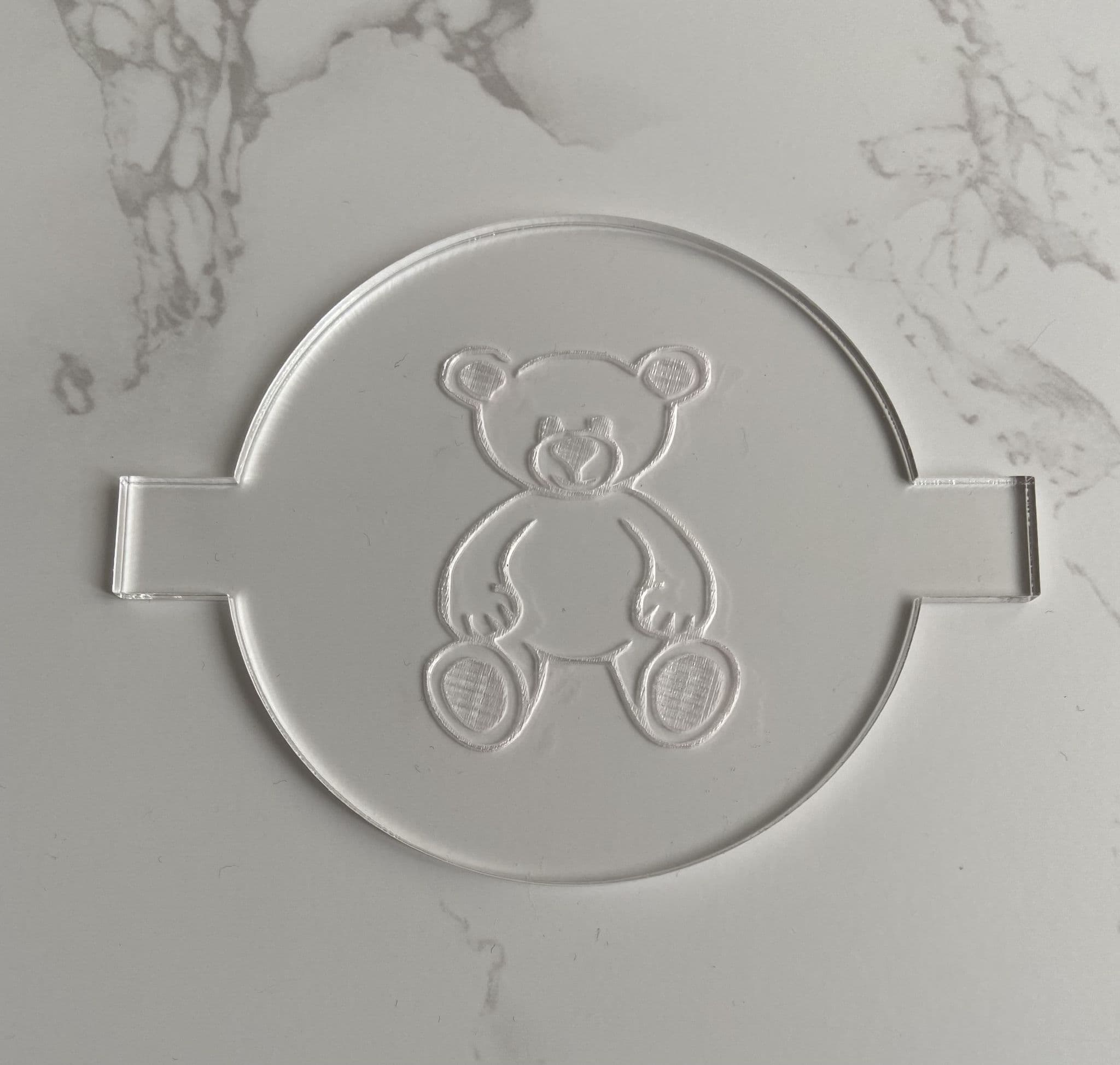 Our teddy bear debossers are made from acrylic, they measure 80mm diameter with the image inside measuring approximately 50mm